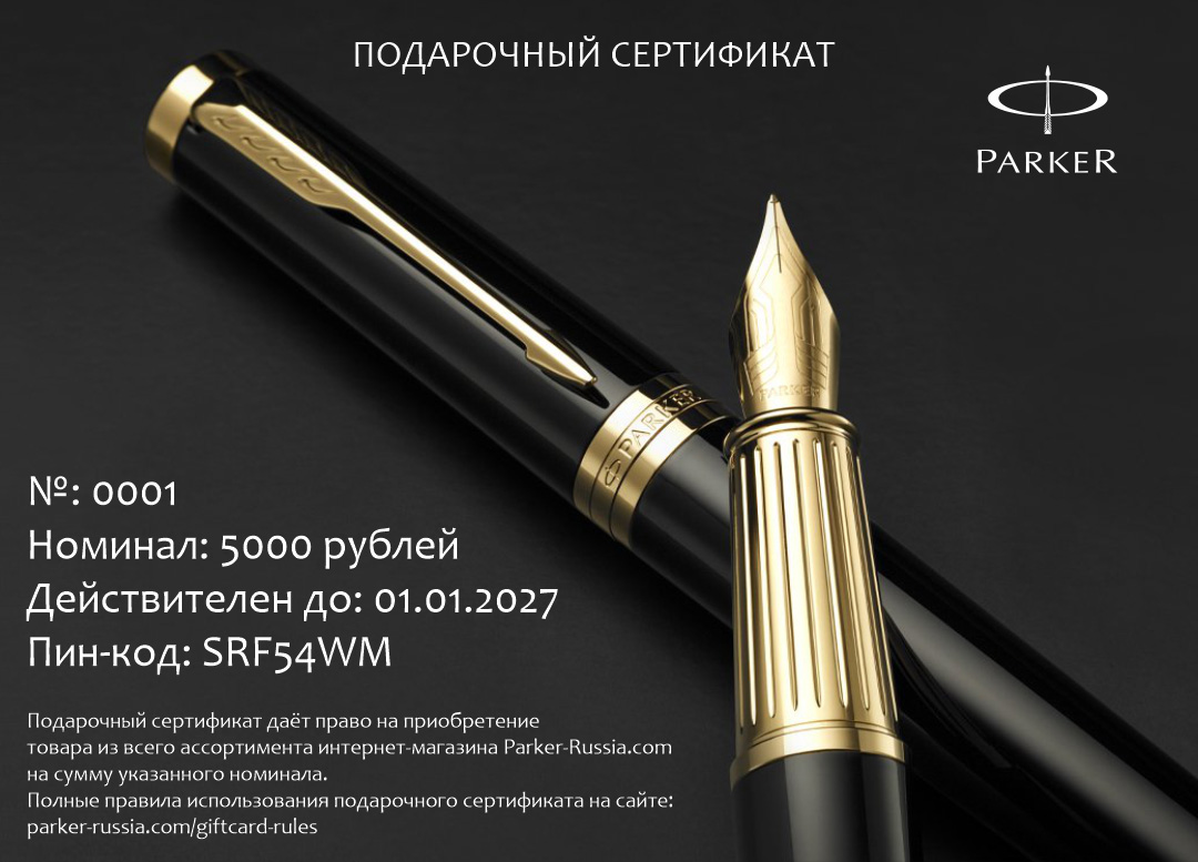 Подарочный сертификат Parker 5000 от официального дилера Parker в Омске. Вы можете дополнительно заказать гравировку, которая подчеркнет Вашу оригинальность и придаст памятность статусному подарку. Все ручки Паркер поставляются в фирменном футляре.